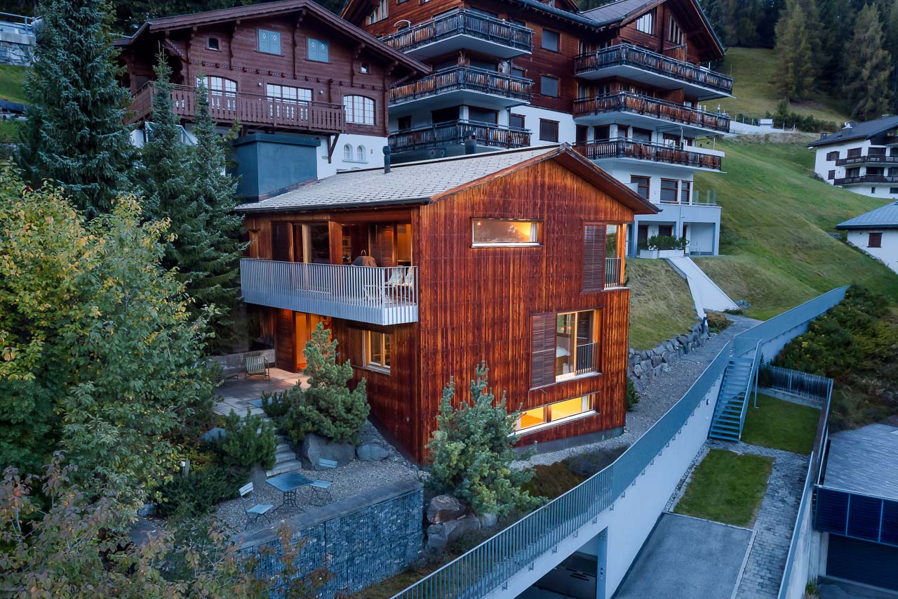Architekturfotografie - Davos, Graubünden,Schweiz - Luxus Einfamilienhaus - Luftaufnahme mit Drohne